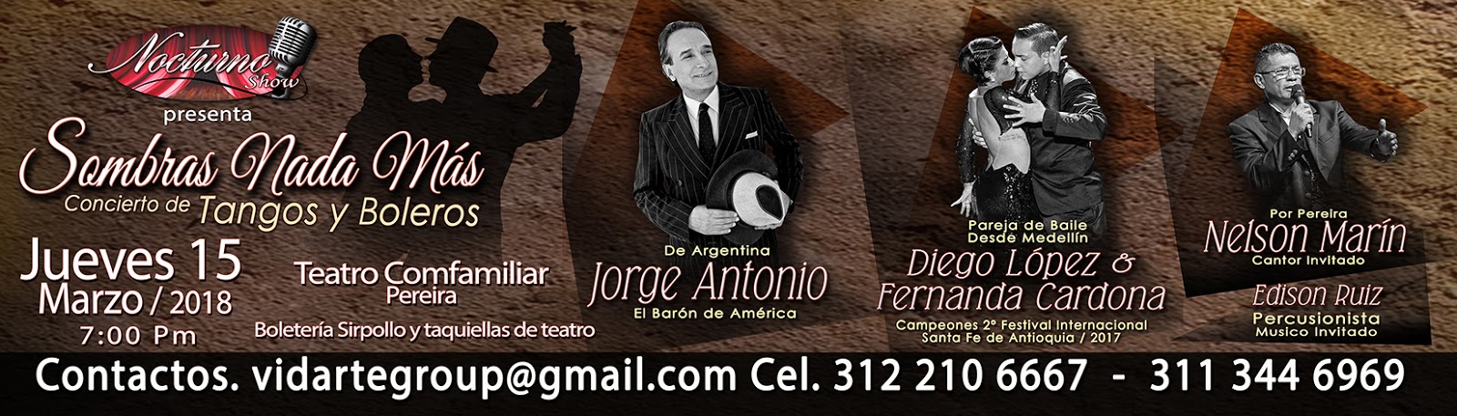 Llega el segundo concierto del año en Nocturno Show, donde el tango se une al bolero, en el espectáculo Sombra Nada Mas, un título originalmente creado en ritmo de tango en 1943, con letra de José María Contursi y la música de Francisco Lomuto, grabado en Argentina como tango por las orquesta de Francisco Canaro, juan D´Arienzo y Aníbal Troilo ente otras. Luego es llevado a otros géneros por grandes figuras como Héctor Lavoe (Salsa 1979), Felipe Pirela (Bolero 1963) y Javier Solís en una de las versiones mas afamadas de esta canción, que graba el ídolo mexicano con mariachi y orquesta, el 8 de febrero de 1965 en versión de bolero Ranchero.
